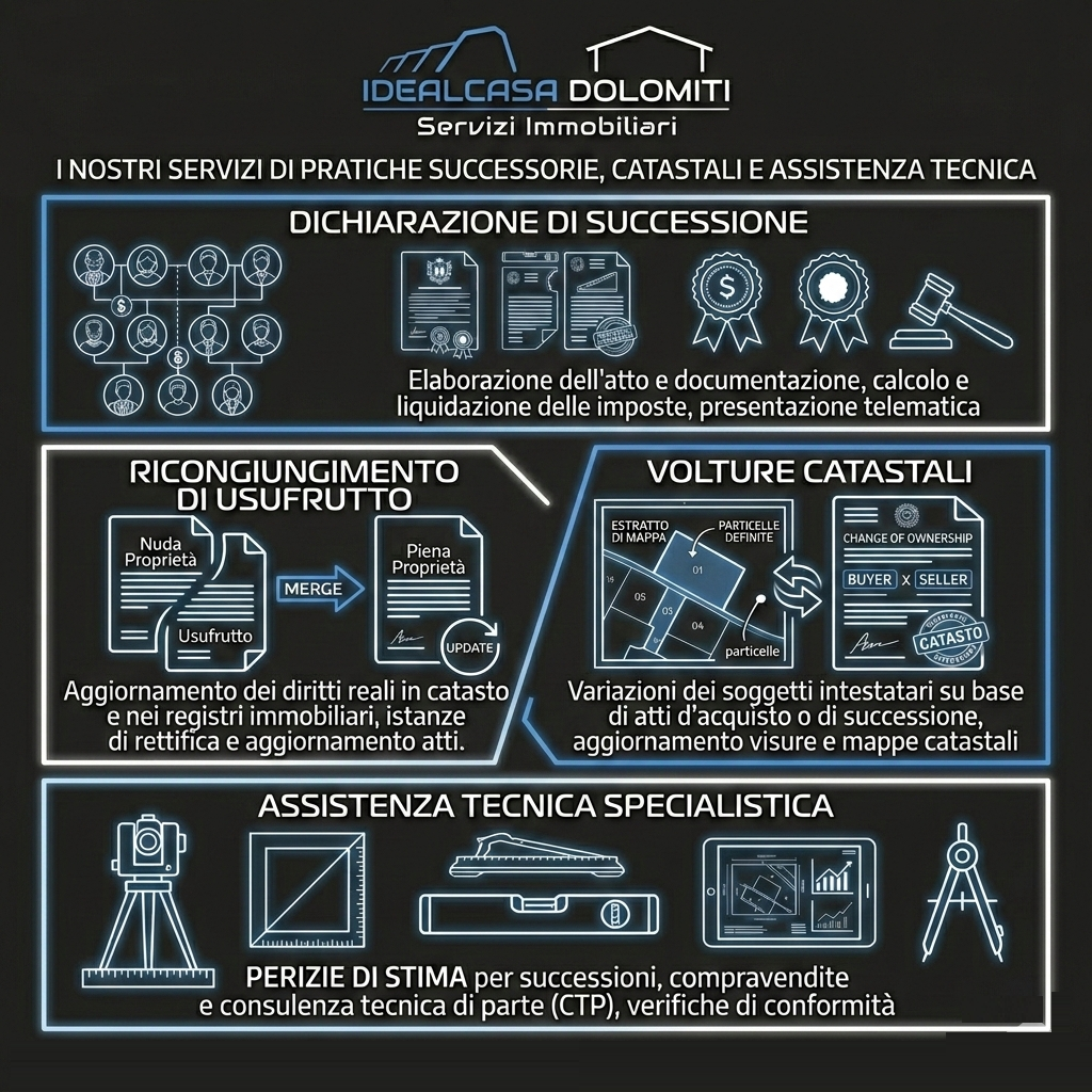 Grazie al nostro studio tecnico interno offriamo soluzioni rapide, efficienti e complete nei seguenti ambiti; progettazione e direzione lavori, redazione di pratiche edilizie, redazione di pratiche catastali per terreni e fabbricati, redazione di rilievi topografici con strumentazione adeguata, redazione di attestati di prestazione energetica, redazione di dichiarazioni di successione e volture, consulenza tecnica e molto altro, il tutto sempre con un unico interlocutore esperto.